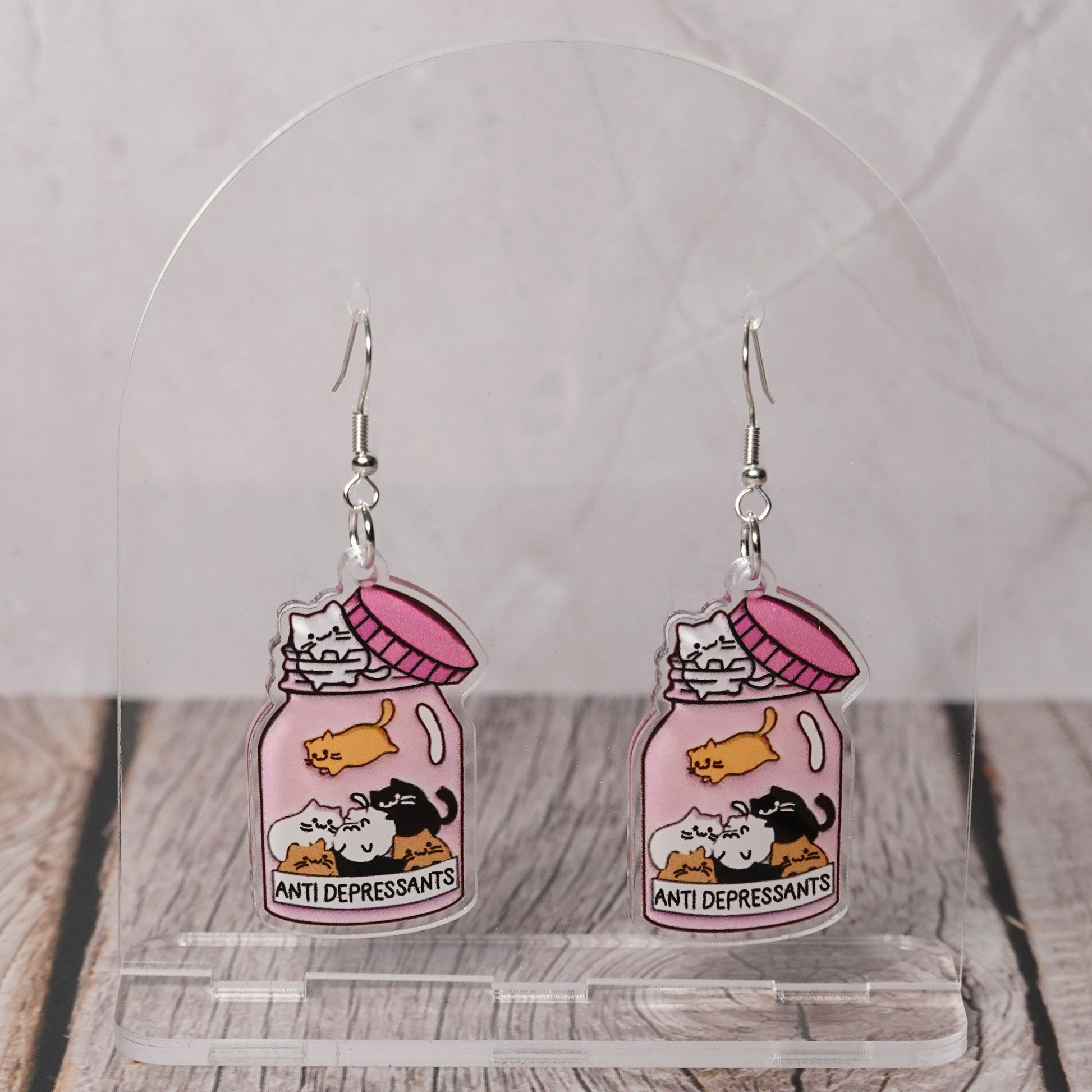 😺 A little jar of joy for your ears! These “Anti Depressants” earrings bottle up the purest kind of happiness - a tiny swarm of mischievous kittens just vibing in pastel chaos. Bright, silly, and instant-serotonin-boosting, they’re the perfect pick-me-up accessory for anyone who believes cute things absolutely count as self-care. Pop them on and carry a pocketful of happy everywhere you go.