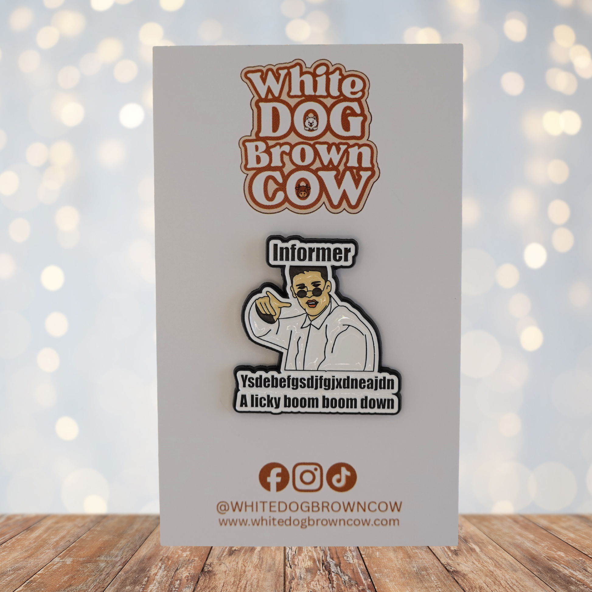 A tribute to one of the most gloriously confusing ’90s songs ever recorded - Informer by Snow. This pin immortalises the mumble-rap line we all pretended to understand: “A licky boom boom down.”